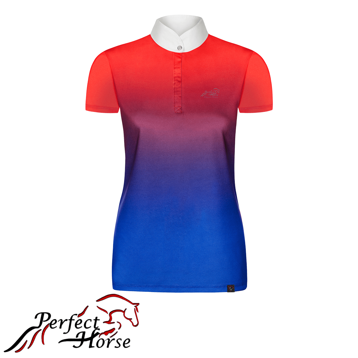 Koszulka konkursowa damska wykonana z najwyższej jakości oddychającego materiału coolmax, którego głównym zadaniem jest zapewnianie dobrej wentylacji ciała i utrzymywanie suchej powierzchni skóry. Materiał drukowany metodą sublimacji, całość zapinana na napy, a stójka ozdobiona kryształami Swarovskiego. Dodatkowego uroku dodaje koszuli srebrne logo na piersi oraz napis “be Perfect…” na karku.